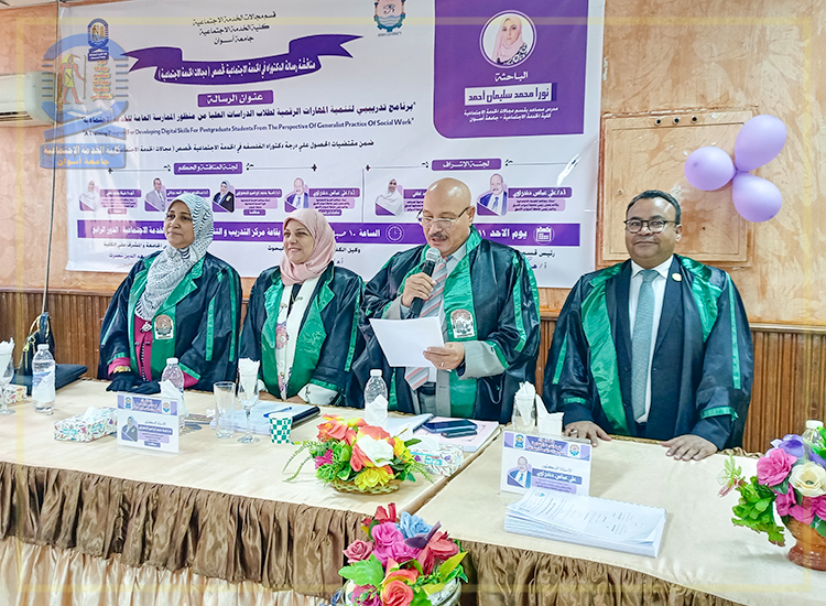 نوقشت اليوم الأحد الموافق ٢٠٢٤/٨/١١م الرسالة العلمية للدارسة “نورا محمد سليمان أحمد– المدرس المساعد بقسم مجالات الخدمة الاجتماعية” وذلك ضمن متقتضيات الحصول على درجة الدكتوراه.