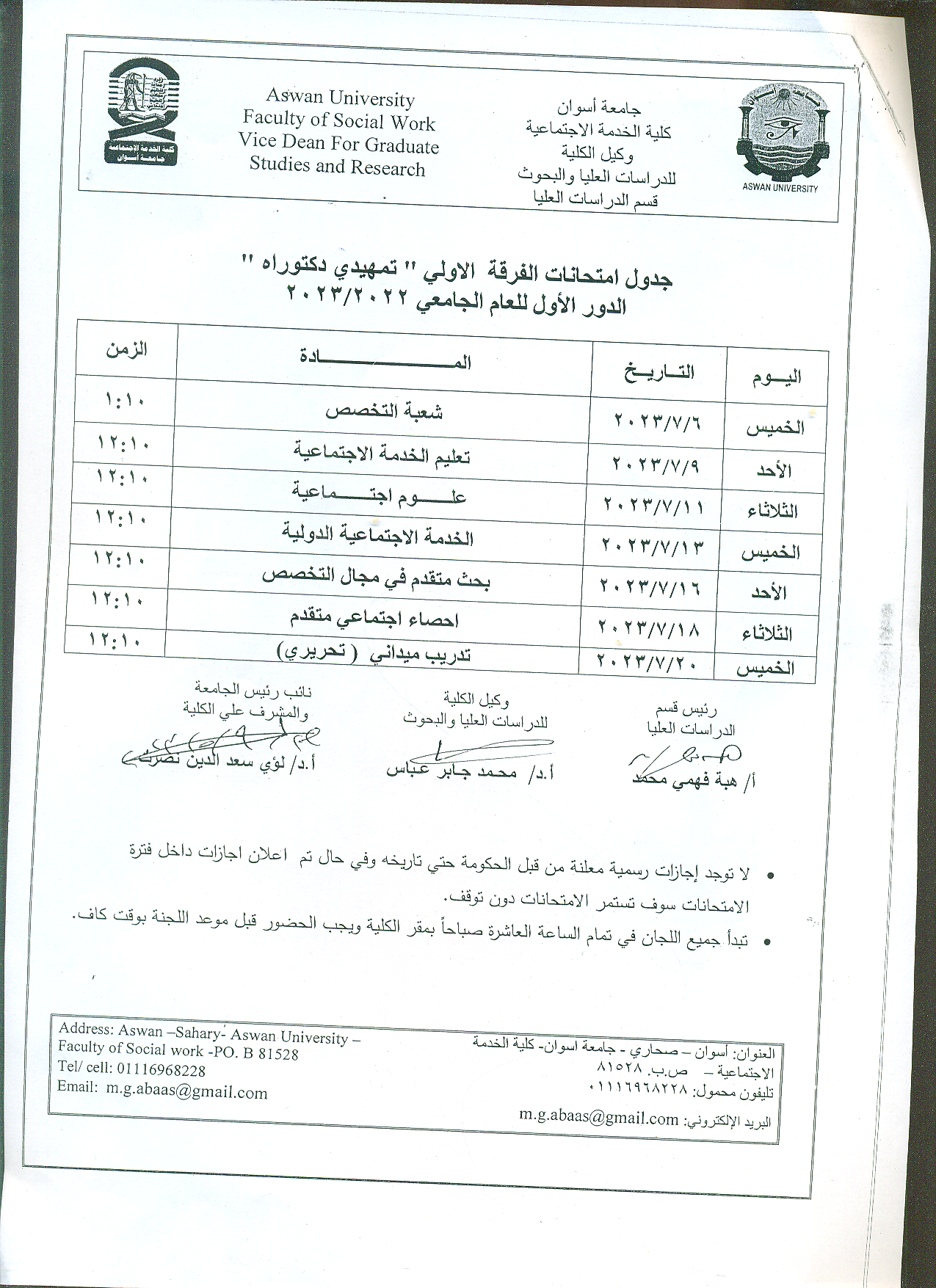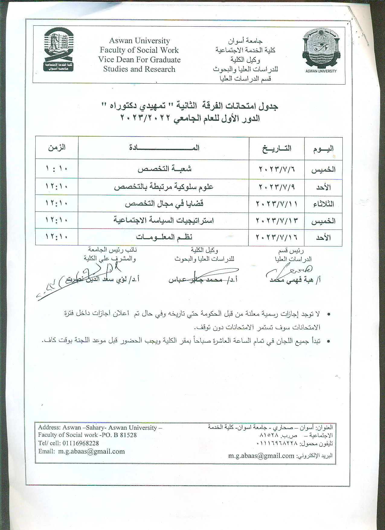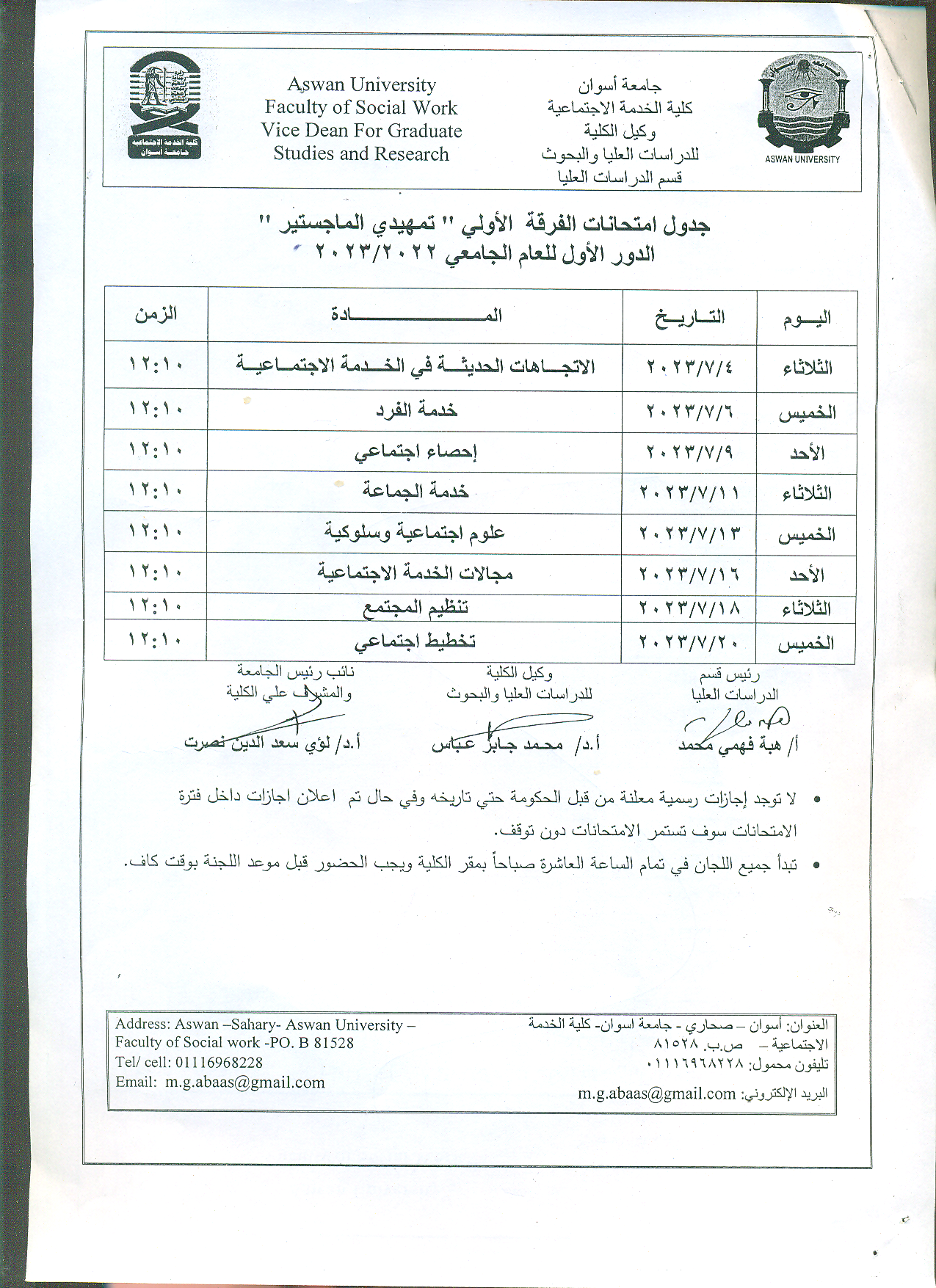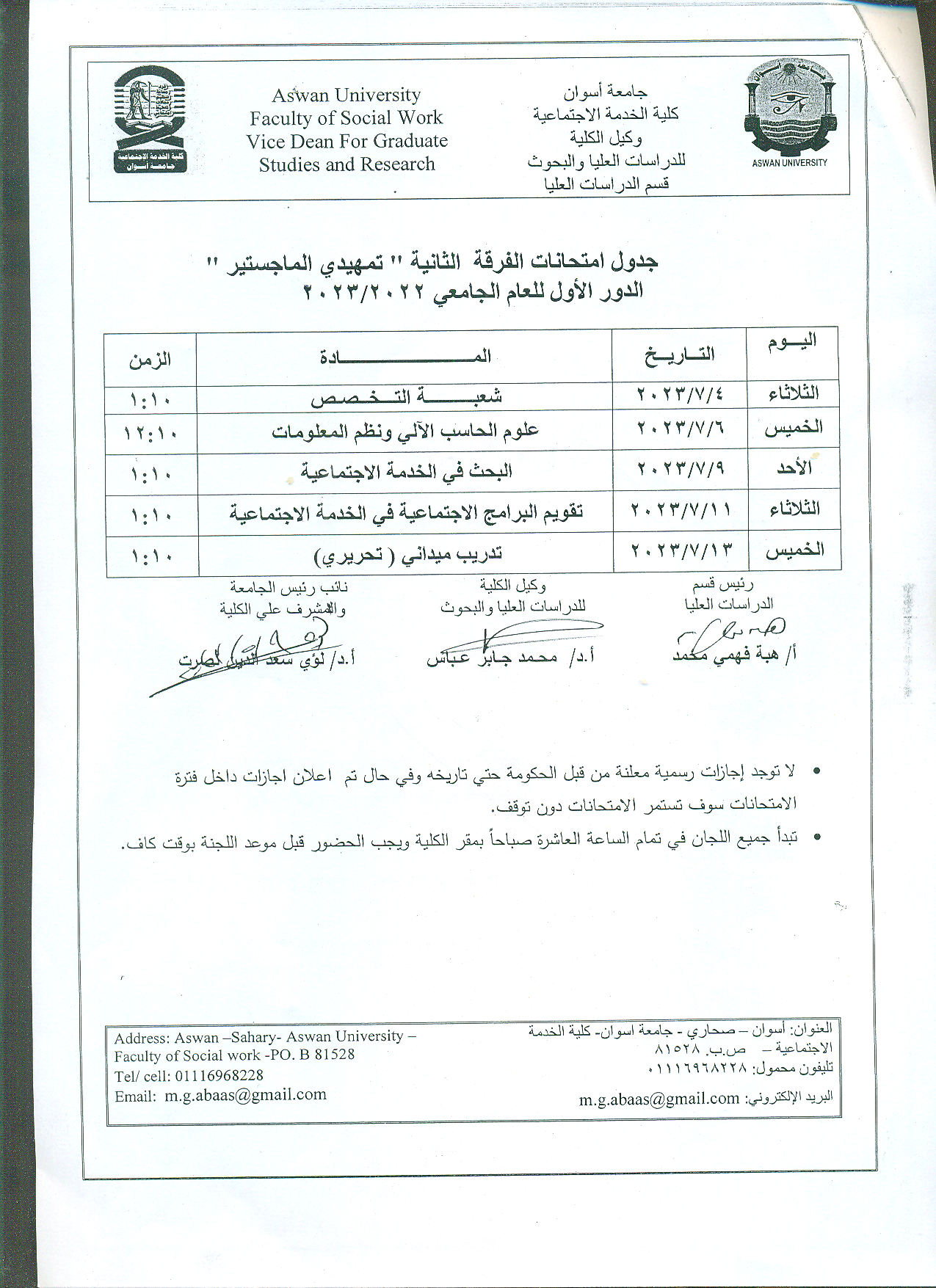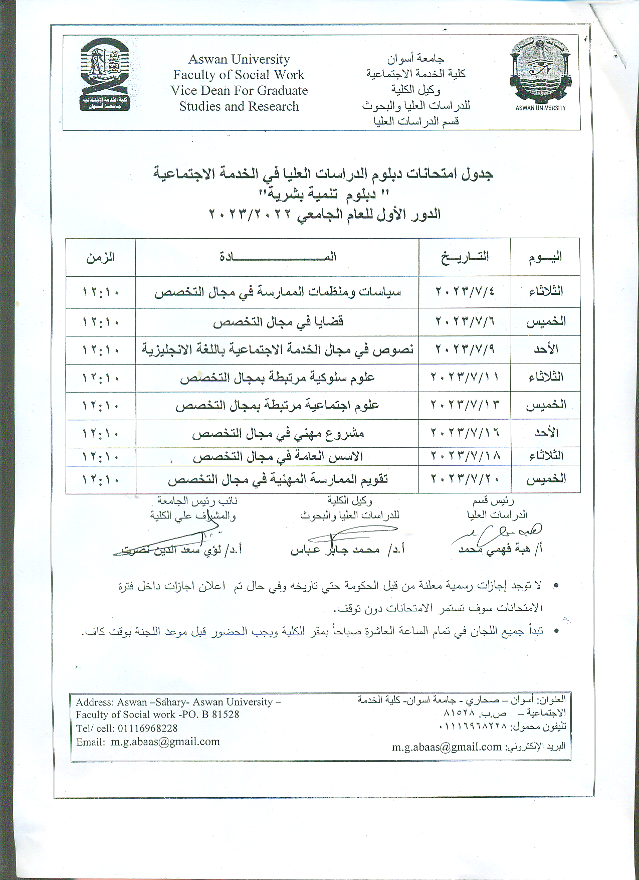 تحت رعاية “أ.د/ لؤي سعد الدين نصرت- نائب رئيس جامعة أسوان والمشرف على كلية الخدمة الإجتماعية”، و “أ.د/محمد جابر عباس – وكيل كلية الخدمة الإجتماعية للدراسات العليا والبحوث” تم إعتماد جدول إمتحانات الدراسات العليا للمراحل الدراسية للدراسات العليا بالكلية للعام الجامعي ٢٠٢٣/٢٠٢٢، وذلك من خلال الرابط التالي: