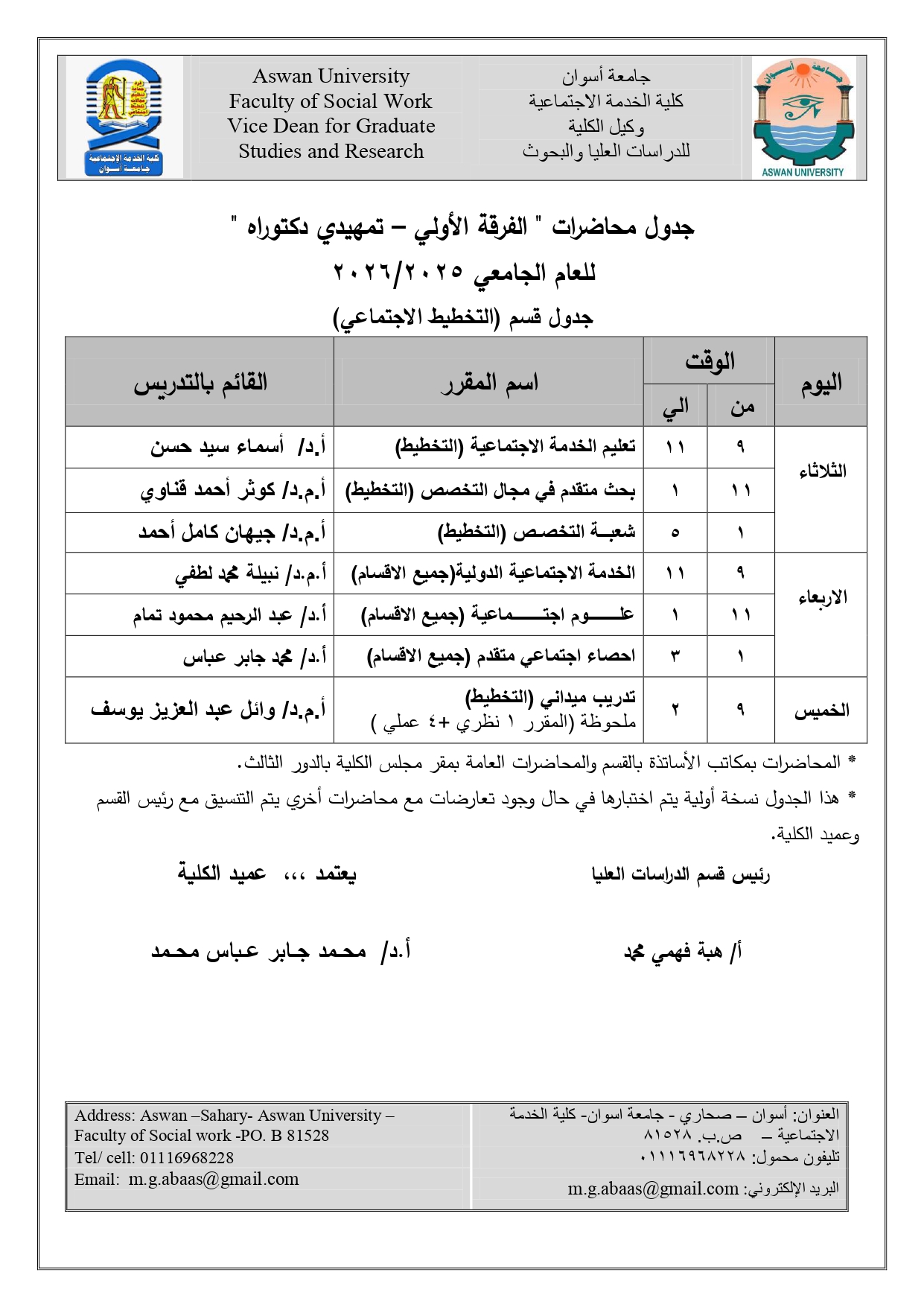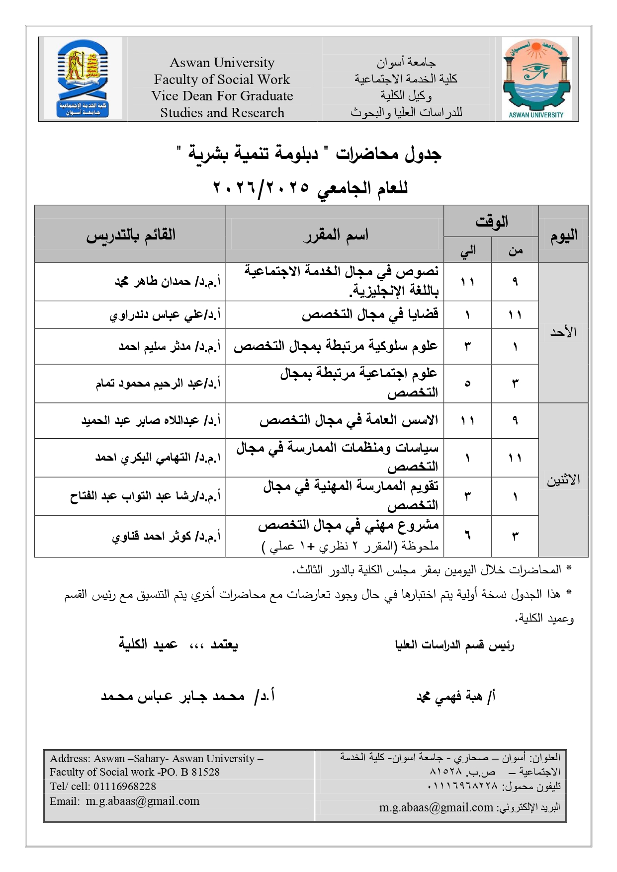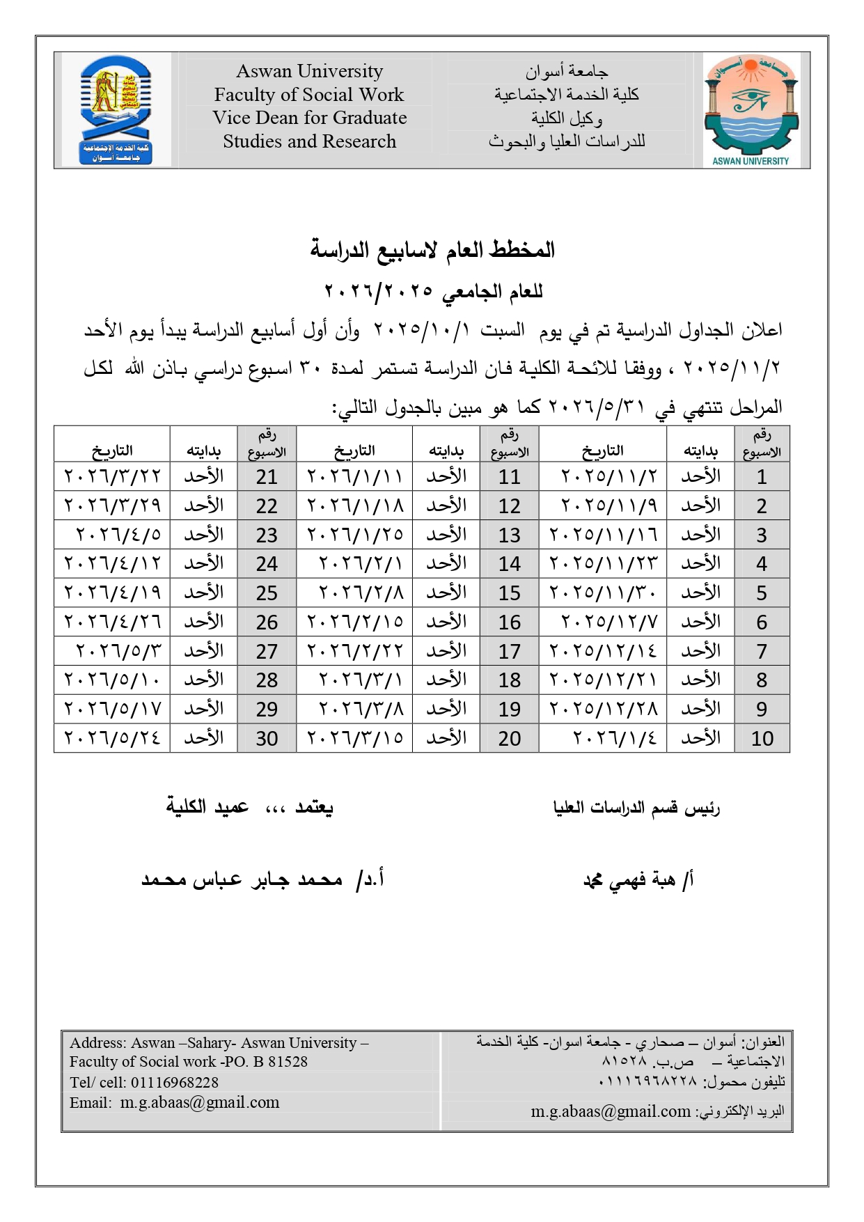 يسعدني ان ارسل لحضراتكم جدول الدراسات العليا للعام الجامعي ٢٠٢٦/٢٠٢٥ م داعيا المولي عز وجل ان يجعله عام خير وتوفيق ونجاح علينا وعلي طلابنا وجامعتنا الفتية ومصرنا الحبيبة مع تمنياتي لكم بكل تقدم وتوفيق.