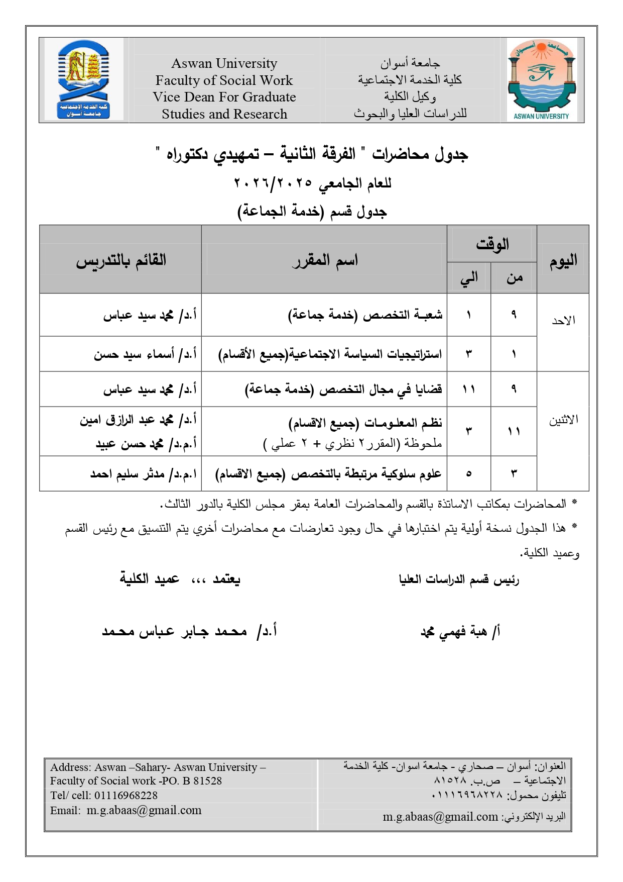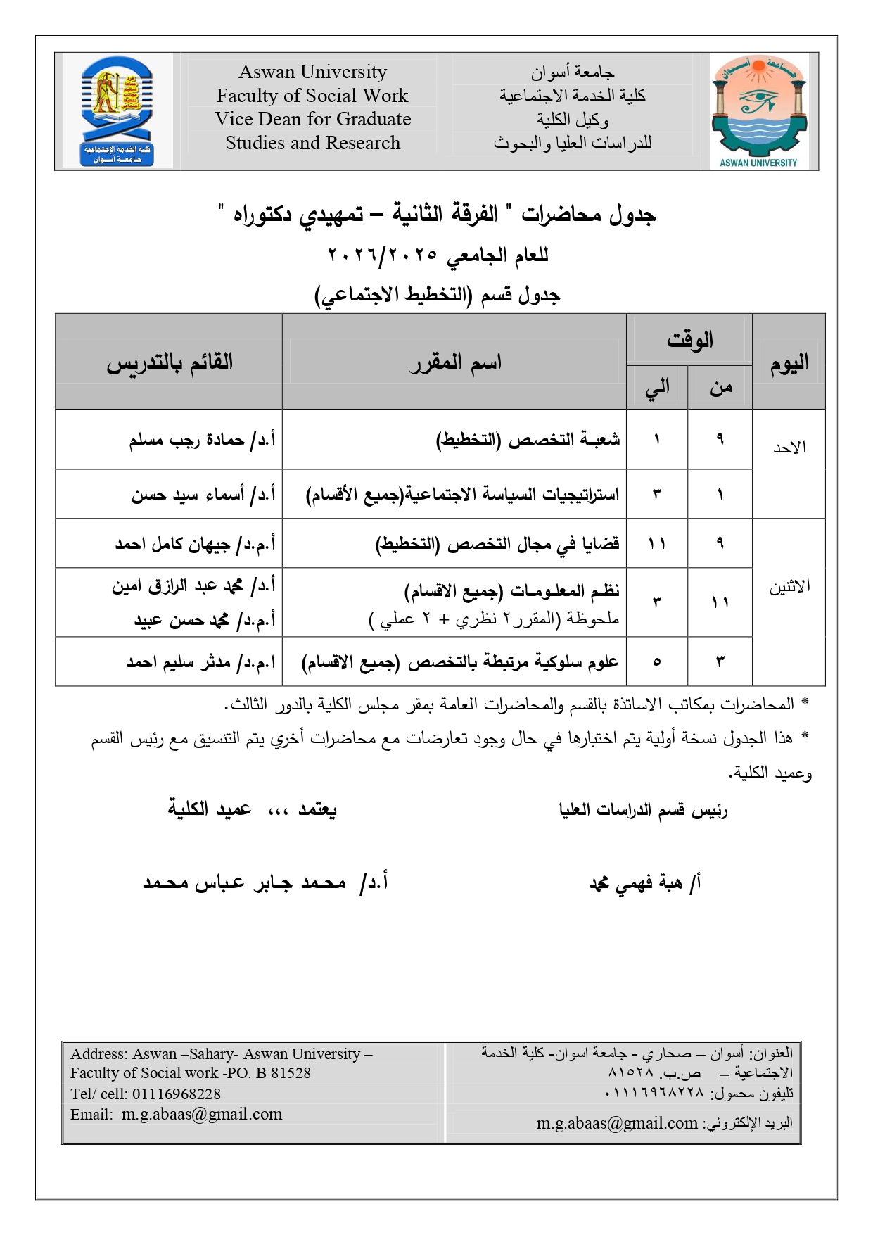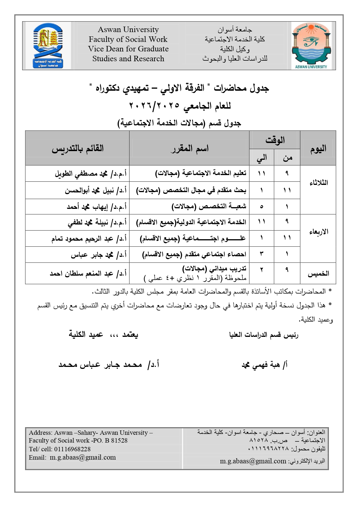 يسعدني ان ارسل لحضراتكم جدول الدراسات العليا للعام الجامعي ٢٠٢٦/٢٠٢٥ م داعيا المولي عز وجل ان يجعله عام خير وتوفيق ونجاح علينا وعلي طلابنا وجامعتنا الفتية ومصرنا الحبيبة مع تمنياتي لكم بكل تقدم وتوفيق.