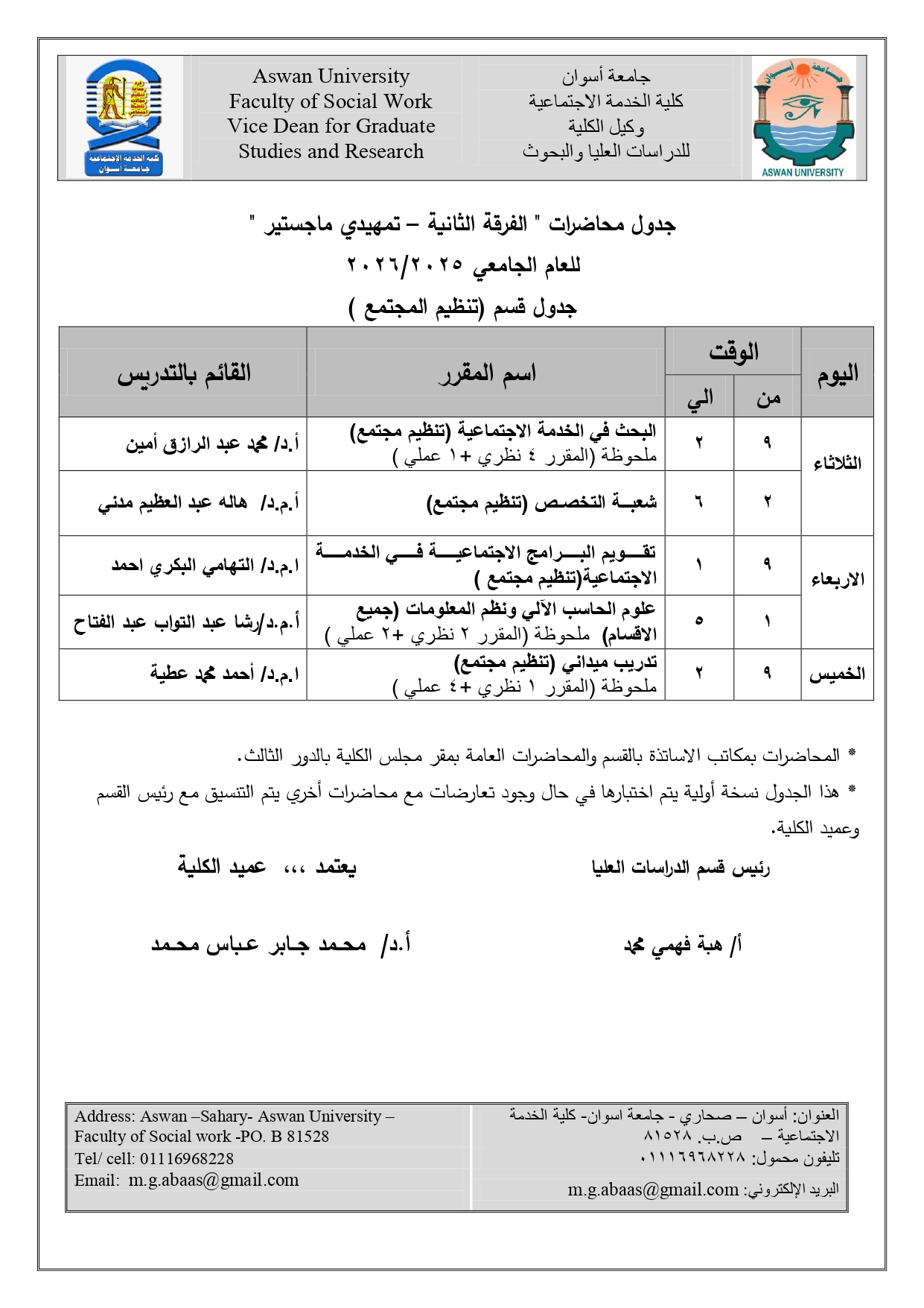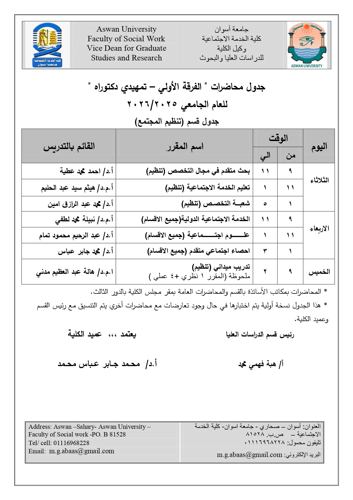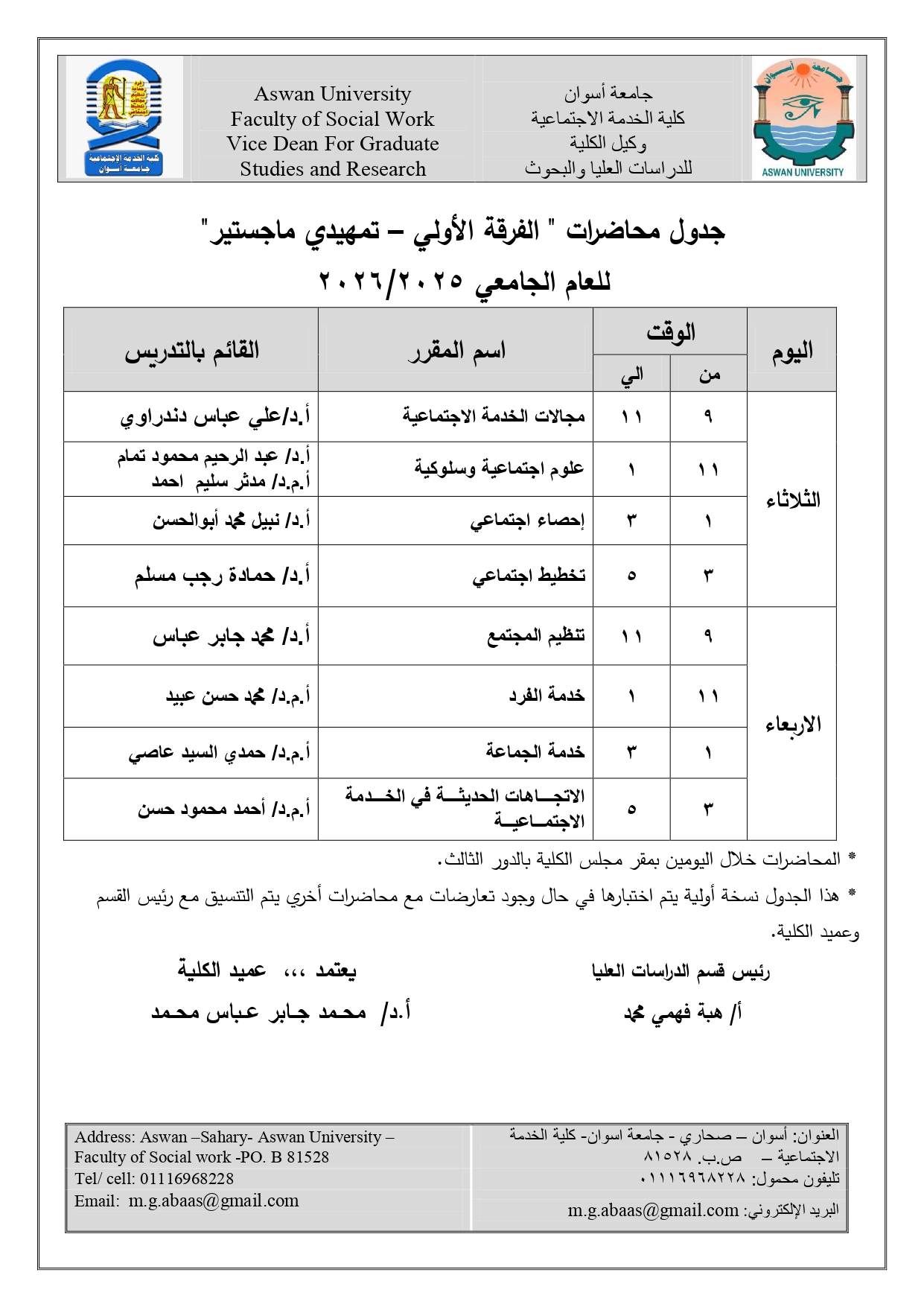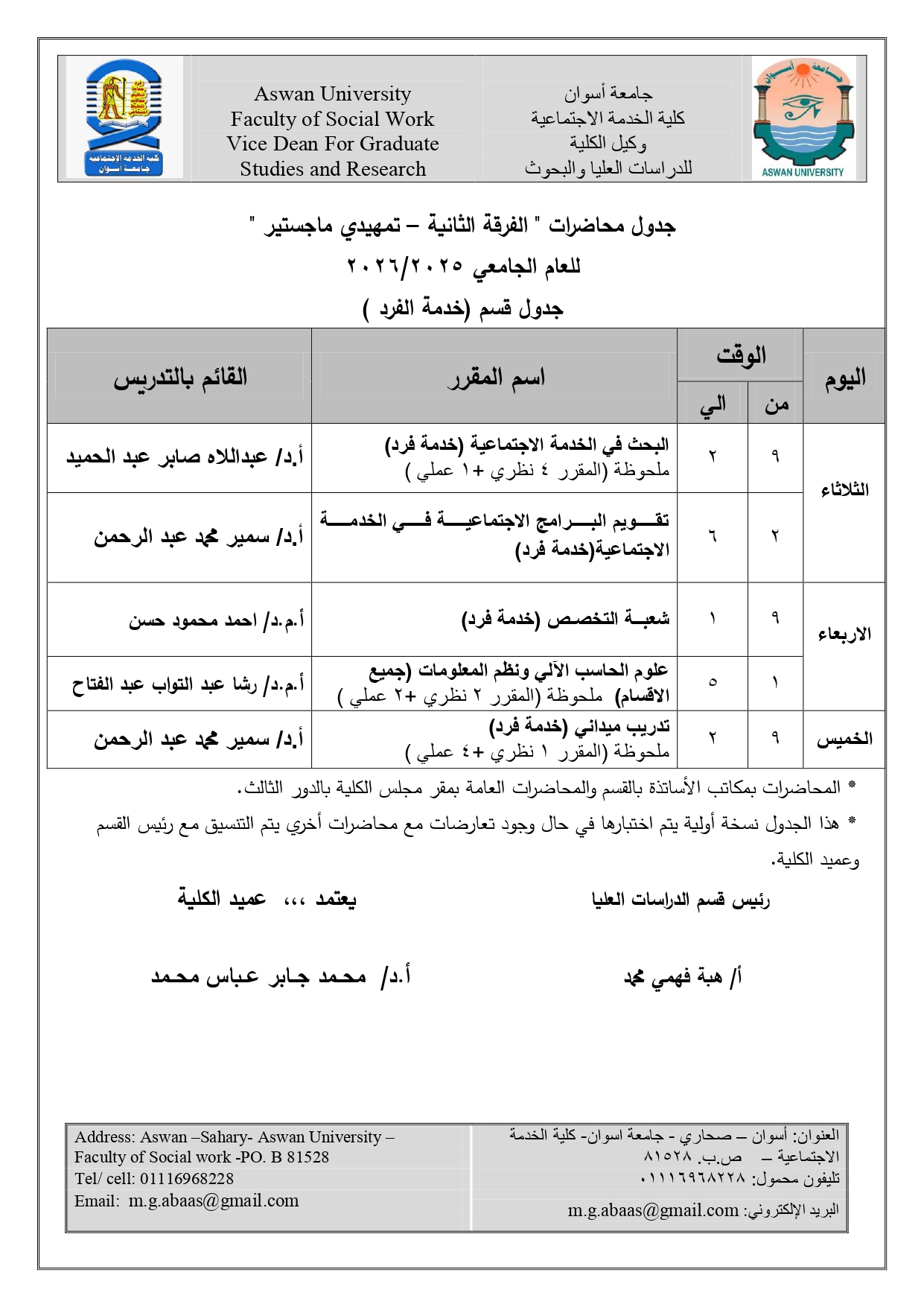 جدول الدراسات العليا للعام الجامعي ٢٠٢٦/٢٠٢٥