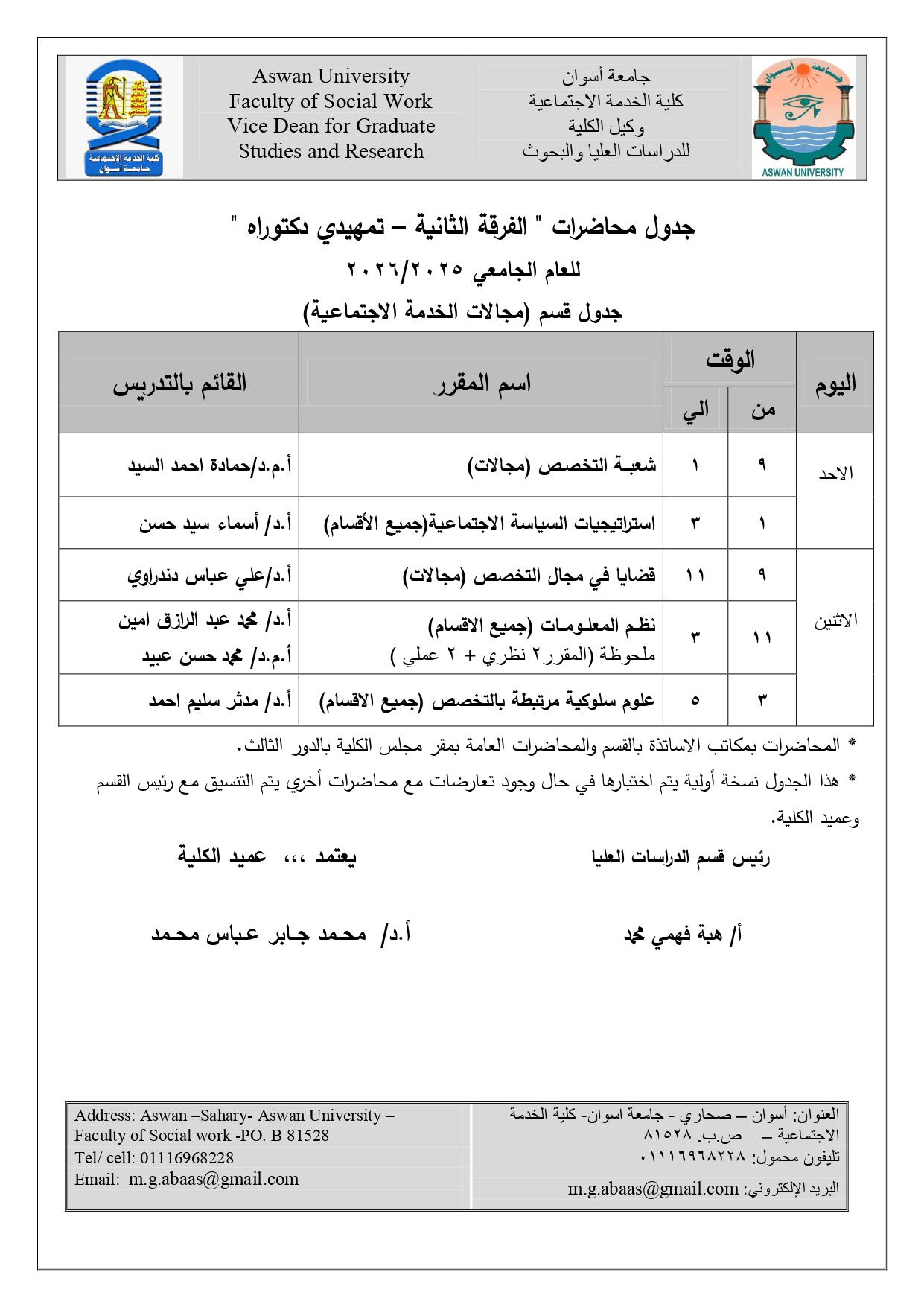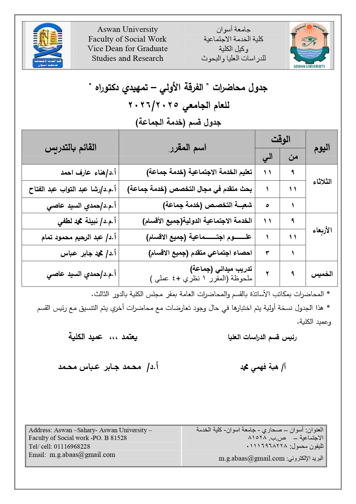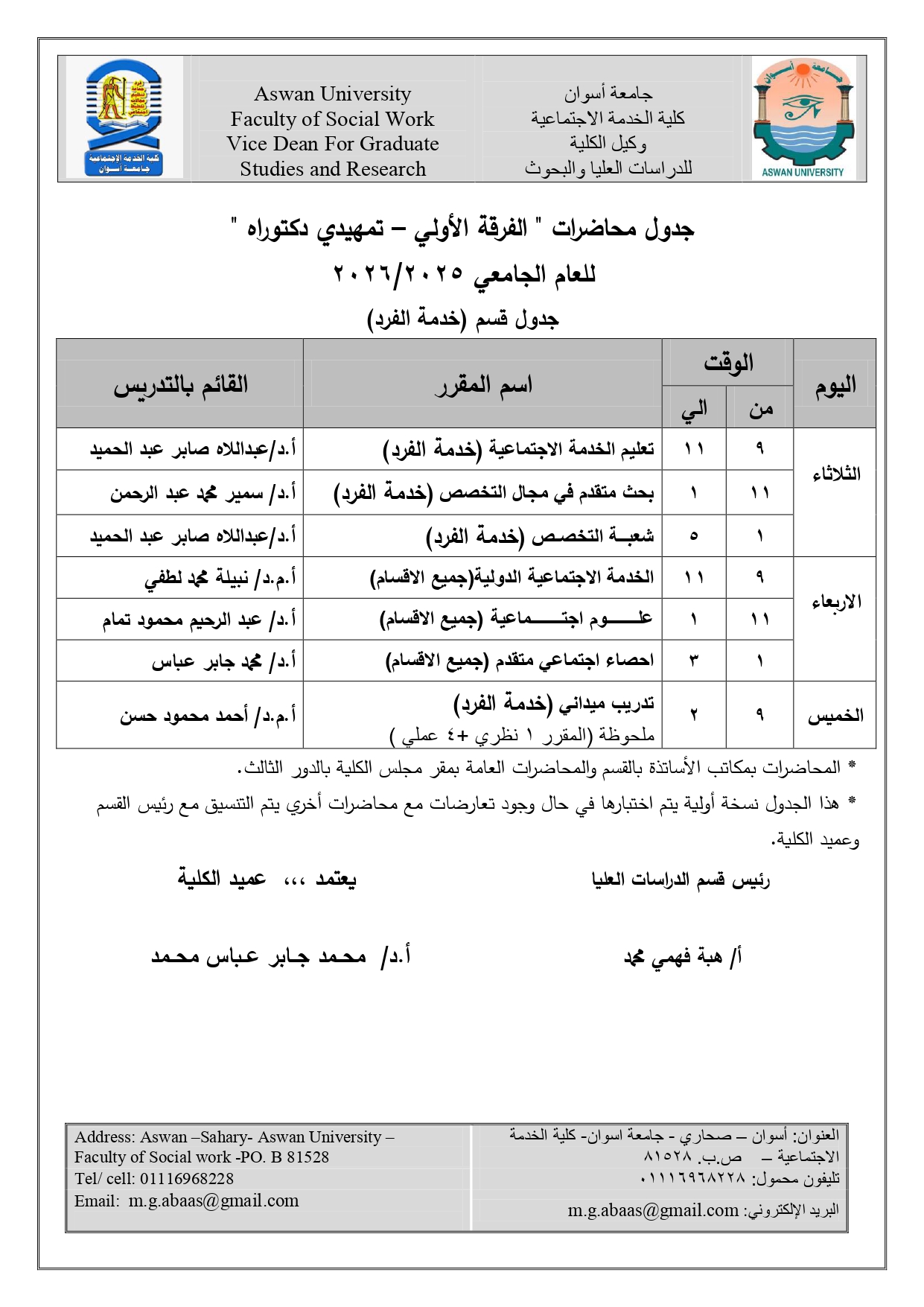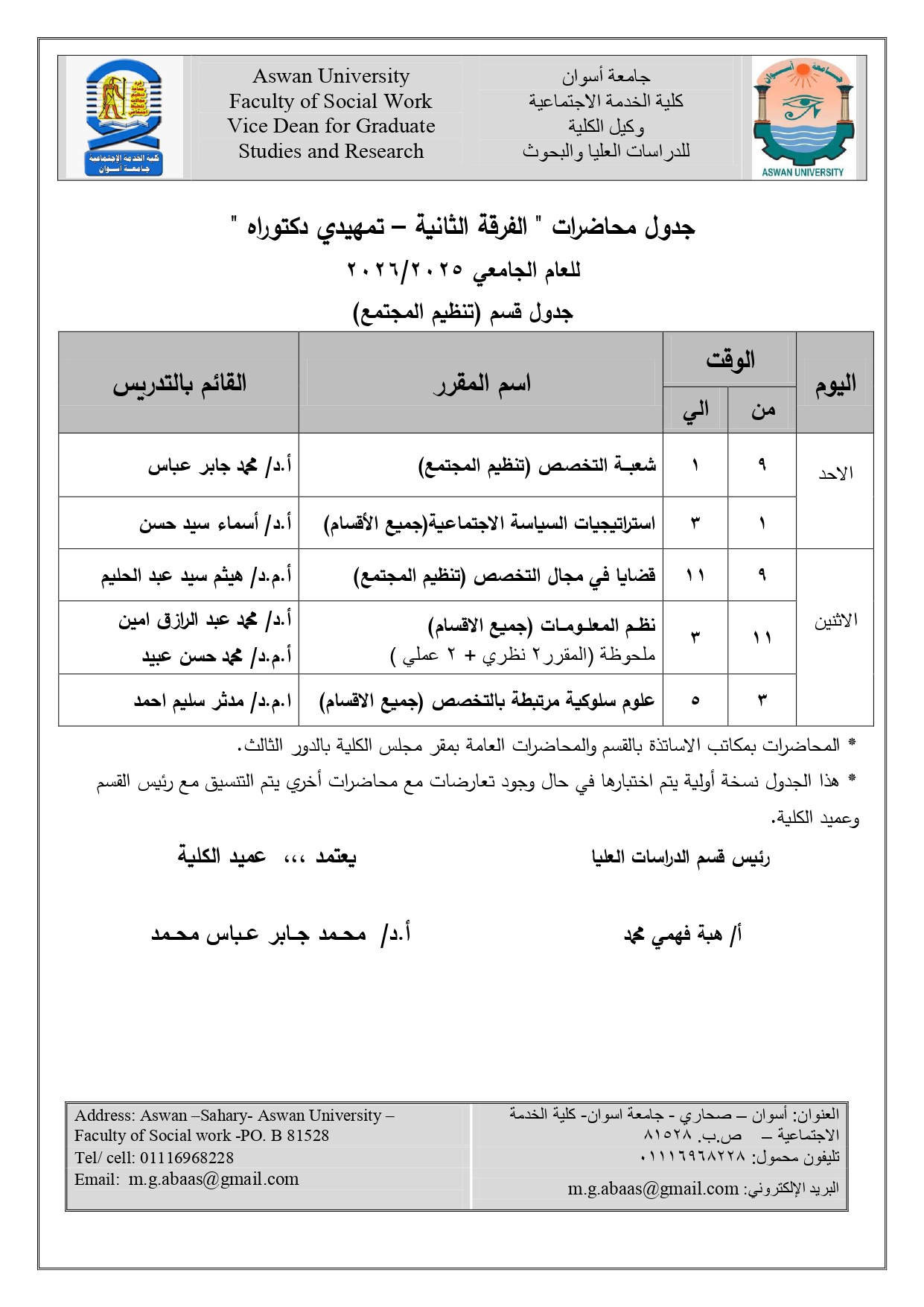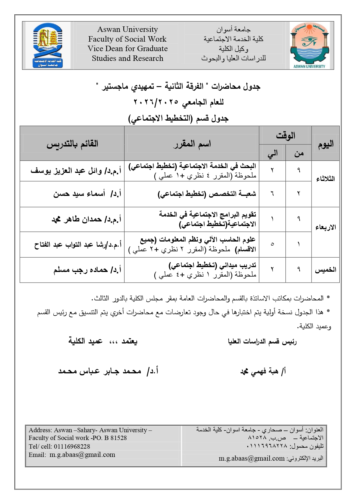 جدول الدراسات العليا للعام الجامعي ٢٠٢٦/٢٠٢٥