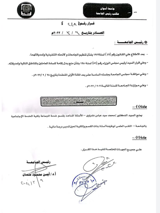 تحت رعاية “الأستاذ الدكتور/ مصطفى مدبولي – رئيس مجلس الوزراء”، و”الأستاذ الدكتور/ ايمن محمود عثمان – رئيس جامعة أسوان”، تقرر منح السيد الأستاذ الدكتور/ محمد سيد عباس دندراوي – الأستاذ المساعد بقسم خدمة الجماعة ووكيل الكلية لشئون التعليم والطلاب بكلية الخدمة الاجتماعية بجامعة أسوان – لقب وظيفة أستاذ بقسم خدمة الجماعة