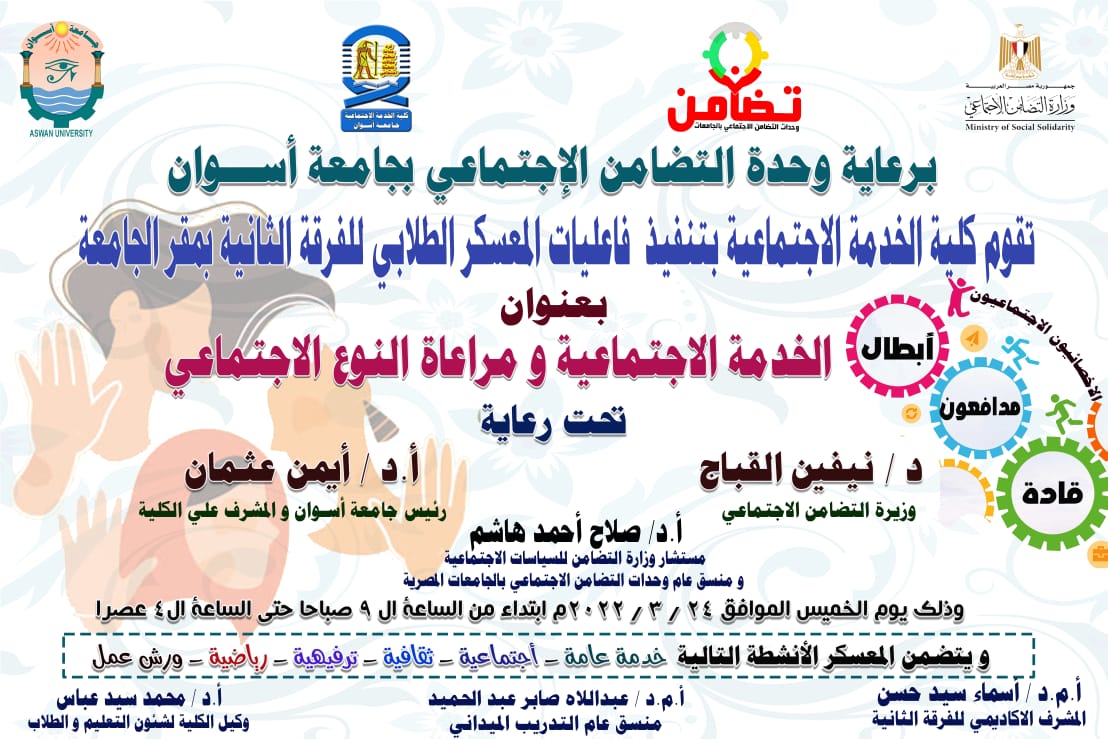 تحت رعاية الأستاذ الدكتور/ أيمن محمود عثمان -رئيس جامعة أسوان والمشرف على كلية الخدمة الإجتماعية، ووحدة التضامن الإجتماعي بجامعة أسوان ، تقوم كلية الخدمة الإجتماعية بتنفيذ فاعليات المعسكر الطلابي للفرقة الثانية بمقر الجامعة، تحت عنوان (الخدمة الإجتماعية ومراعاة النوع الإجتماعي).