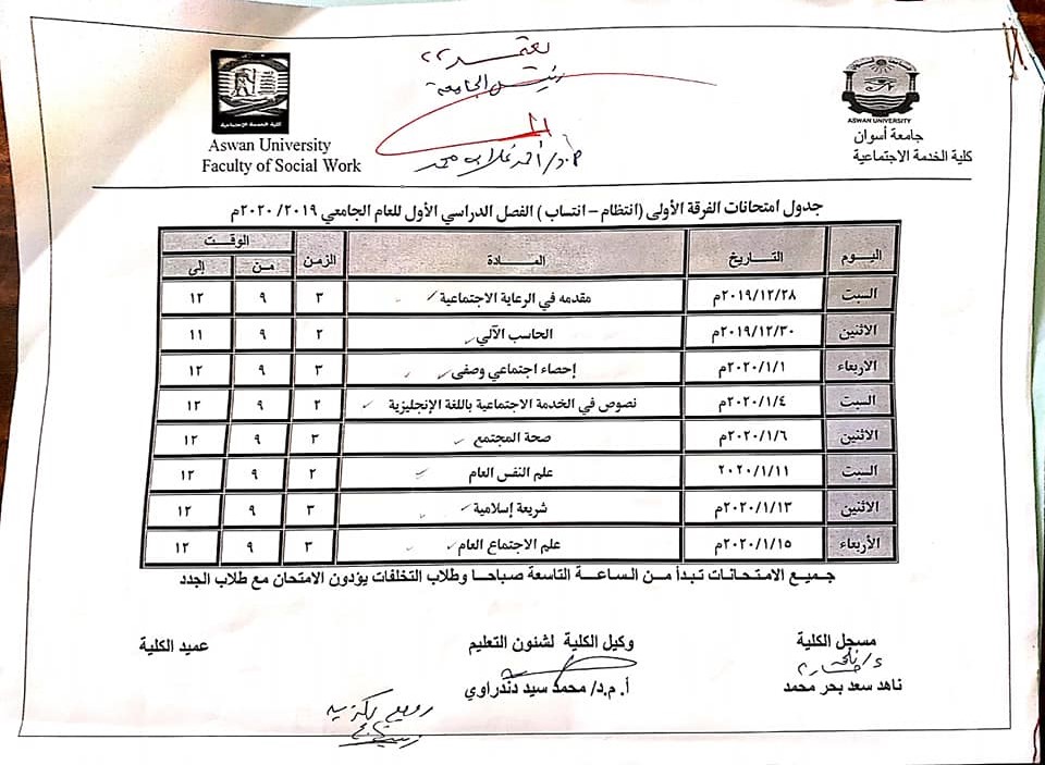 جداول أمتحانات الفصل الدراسي الأول للعام الجامعى 2020/2019