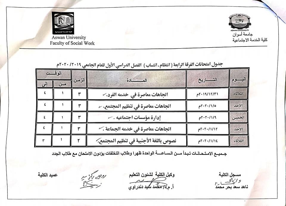 جدول أمتحان الفرقة الرابعة (انتظام- انتساب) الفصل الدراسي الأول للعام الجامعى 2020/2019