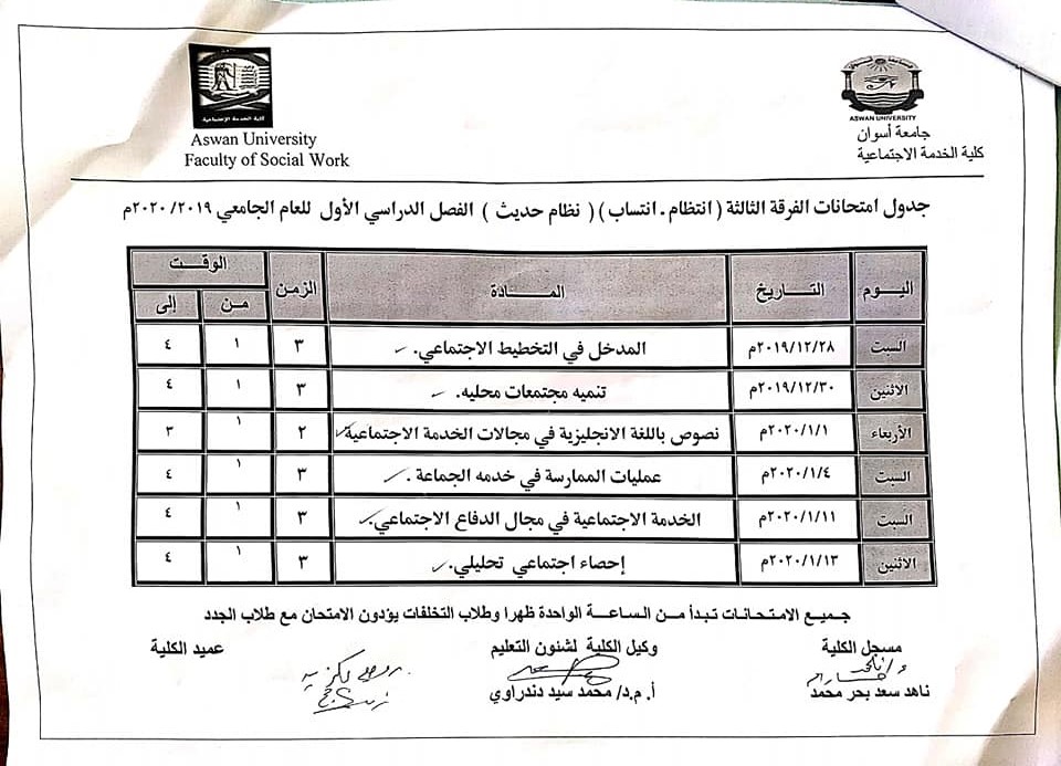 جدول أمتحان الفرقة الثالثة (انتظام- انتساب) (نظام حديث) الفصل الدراسي الأول للعام الجامعى 2020/2019