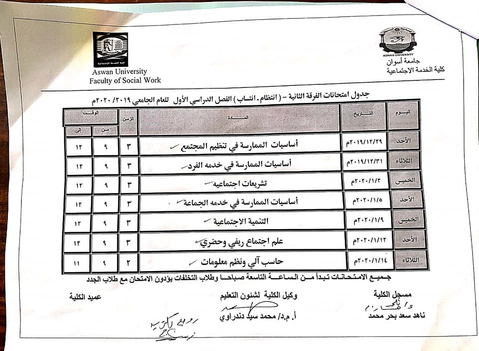 جدول أمتحان الفرقة الثانية (انتظام- انتساب) الفصل الدراسي الأول للعام الجامعى 2020/2019