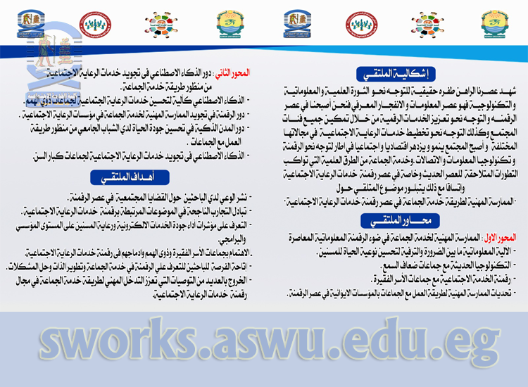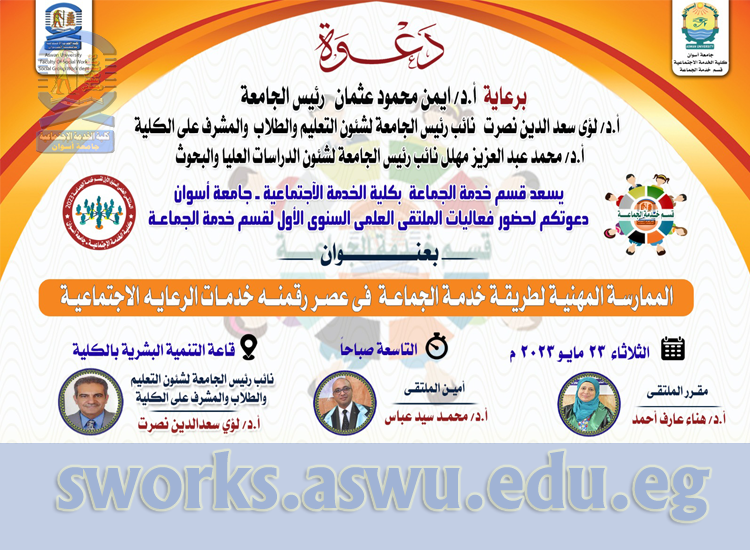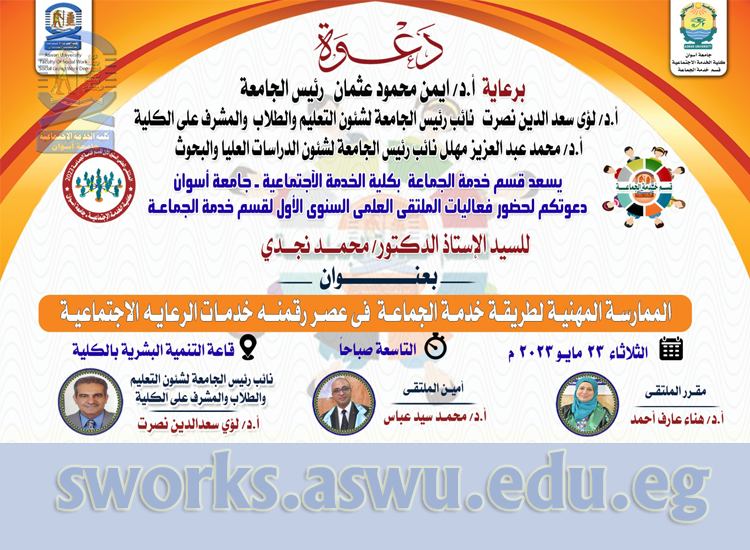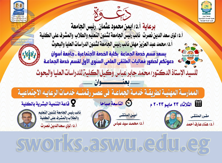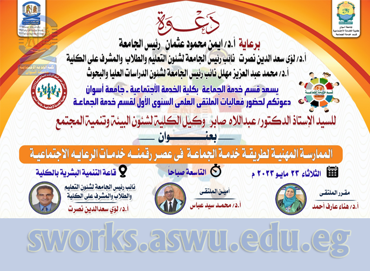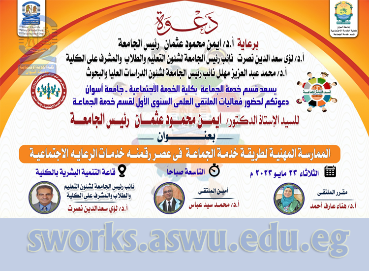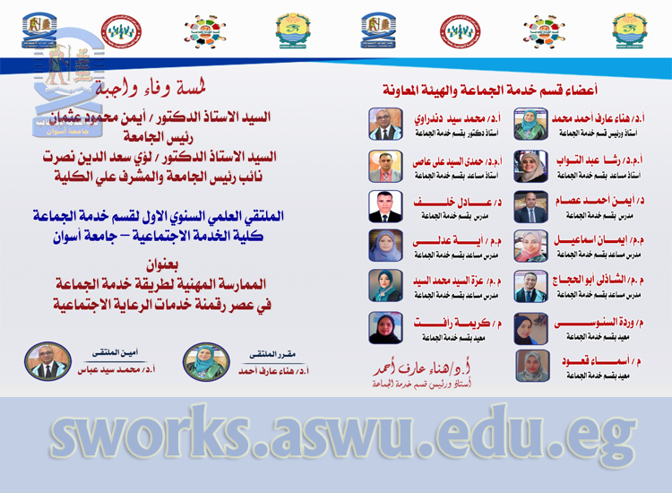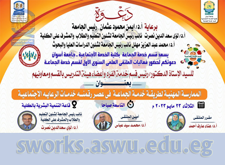 برعاية كريمة من الأستاذ الدكتور/ أيمن محمود عثمان- رئيس جامعة أسوان، والأستاذ الدكتور/ لؤي سعد الدين نصرت- نائب رئيس الجامعة لشئون التعليم والطلاب والمشرف على الكلية، والأستاذ الدكتور/ محمد عبد العزيز مهلل- نائب رئيس الجامعة لشئون الدراسات العليا والبحوث يعلن قسم خدمة الجماعة عن “الملتقى العلمي السنوي الأول”.