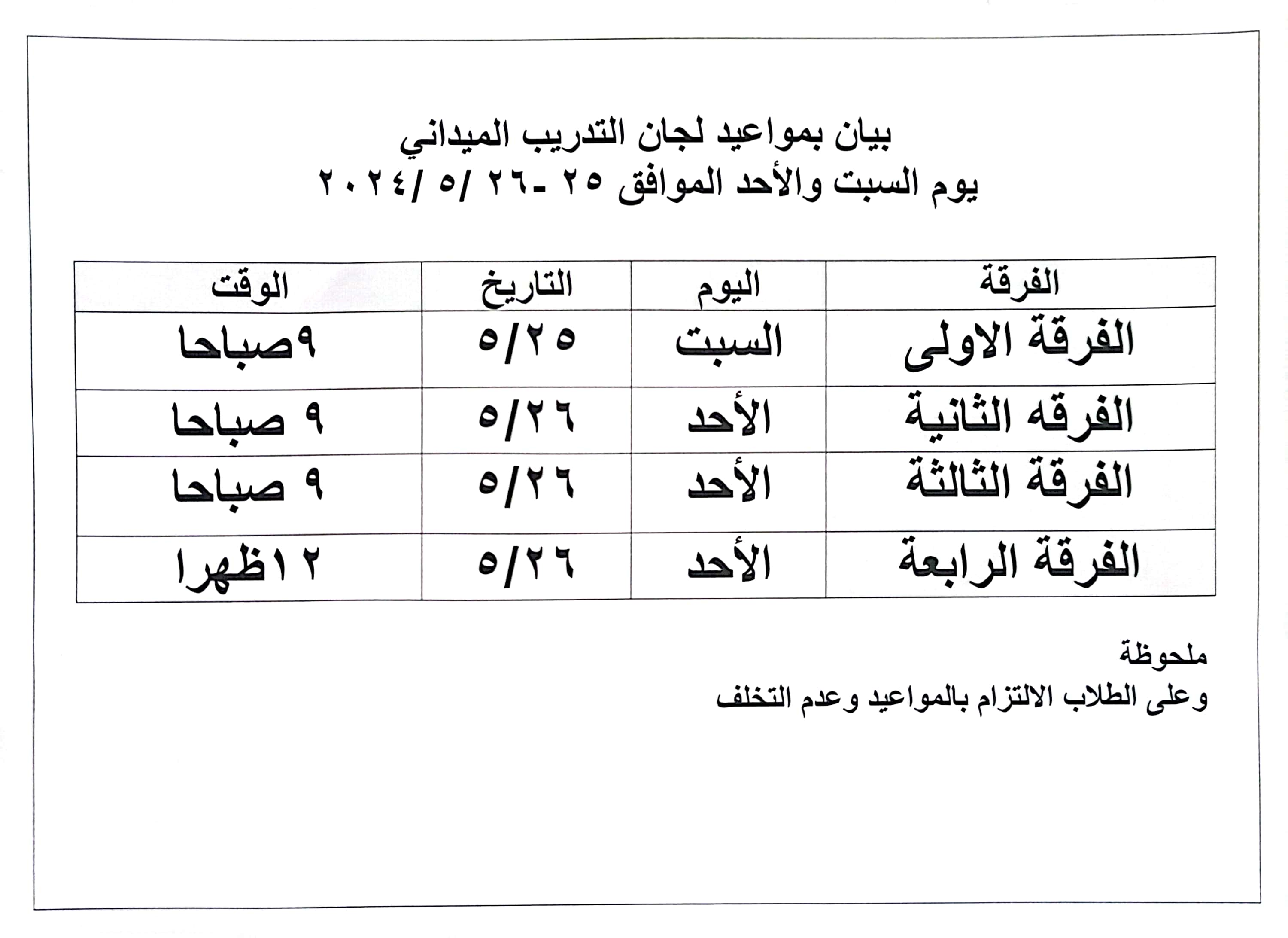 مواعيد لجان التدريب الميداني