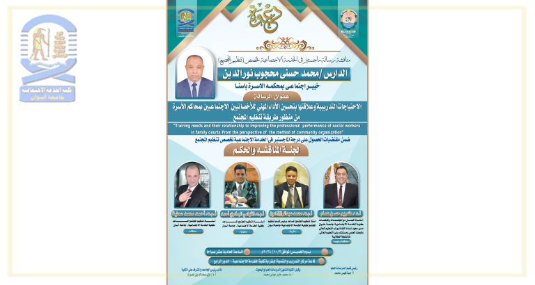 تقرر مناقشة الباحث/ محمد حسني محجوب نور الدين- بقسم تنظيم المجتمع مرحلة الماجستير في يوم الخميس الموافق ٢٠٢٤/١٠/٣م...