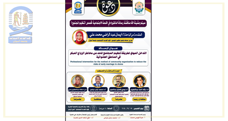 تقرر مناقشة الباحثة/ إيمان عبدالراضي محمد علي- المدرس المساعد بقسم تنظيم المجتمع مرحلة الدكتوراه في يوم الخميس الموافق...