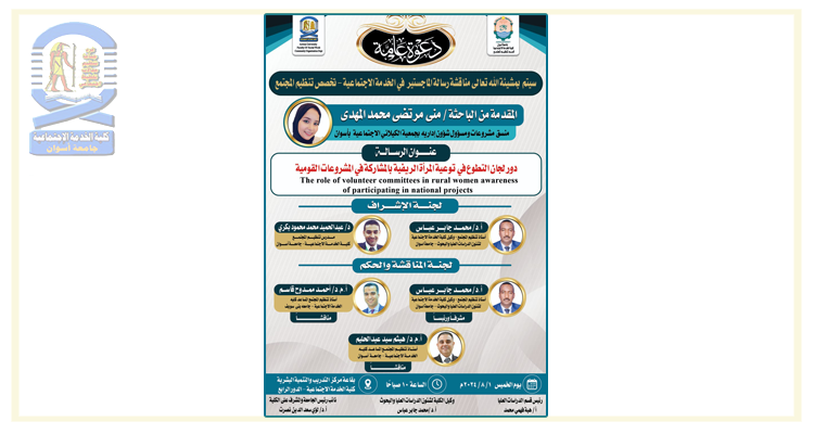 تقرر مناقشة الباحثة/ منى مرتضى محمد المهدي- بقسم تنظيم المجتمع مرحلة الماجستير في يوم الخميس الموافق ٢٠٢٤/٨/١م في...