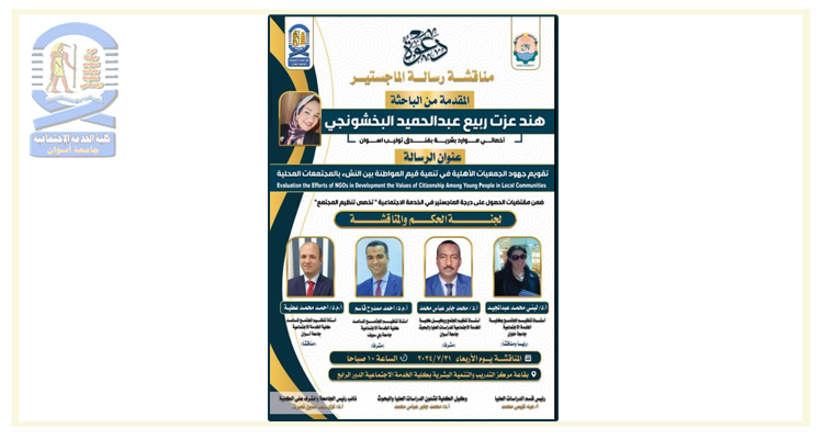 تقرر مناقشة الباحثة/ هند عزت ربيع عبدالحميد البخشونجي- بقسم تنظيم المجتمع مرحلة الماجستير في يوم الأربعاء الموافق ٢٠٢٤/٧/٣١م في...