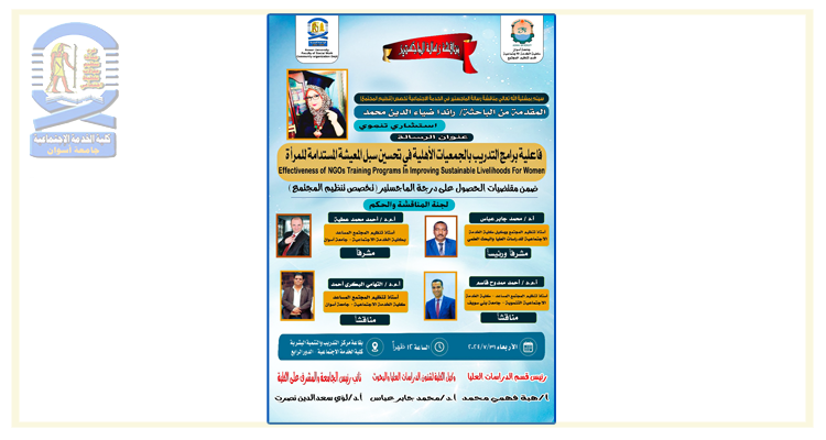 تقرر مناقشة الباحثة/ راندا ضياءالدين محمد- بقسم تنظيم المجتمع مرحلة الماجستير في يوم الأربعاء الموافق ٢٠٢٤/٧/٣١م في تمام...