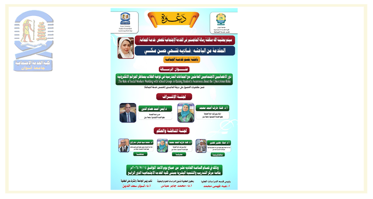 تقرر مناقشة الباحثة/ فاديه فتحي حسن مكي- بقسم خدمة الجماعة مرحلة الماجستير في يوم الأحد الموافق ٢٠٢٤/٧/١٤م في...