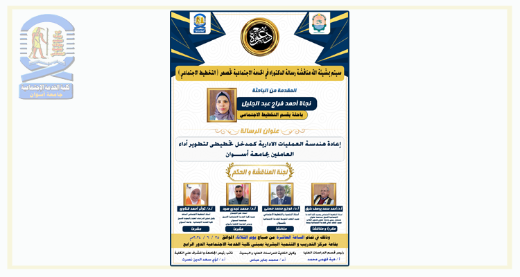 تقرر مناقشة الباحثة/ نجاة أحمد فرّاج عبدالجليل- بقسم التخطيط الاجتماعي مرحلة الدكتوره في يوم الثلاثاء الموافق ٢٠٢٤/٦/٢٥م في...