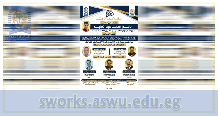 تقرر مناقشة الباحث / باسم محمد عبدالحليم- بقسم تنظيم المجتمع مرحلة الماجستير في يوم الأربعاء الموافق ٢٠٢٤/٥/٢٢م في...