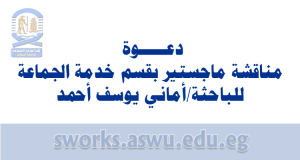 دعـــــوة مناقشة ماجستير بقسم خدمة الجماعة للباحثة/أماني يوسف أحمد خليل