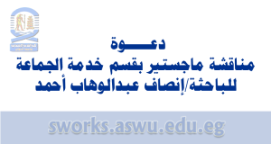 دعـــــوة مناقشة ماجستير بقسم خدمة الجماعة للباحثة/إنصاف عبدالوهاب أحمد