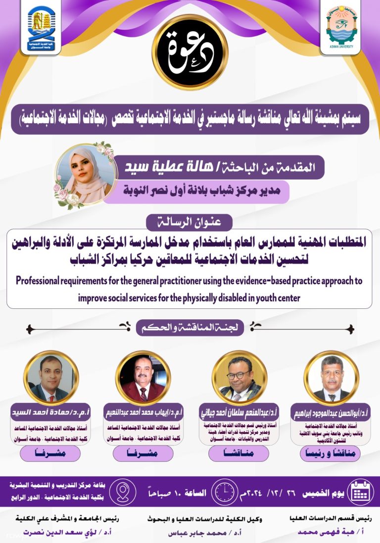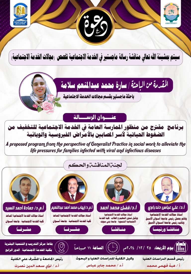 دعـــــوة مناقشة ماجستير بقسم خدمة الجماعة للباحثة/إنصاف عبدالوهاب أحمد