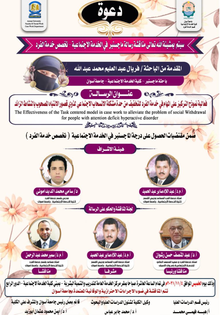 سيتم مناقشة رسالة ماجستير في الخدمة الاجتماعية – تخصص خدمة الفرد – المقدمة من الباحثة / فريال عبدالعليم محمد عبدالله ...