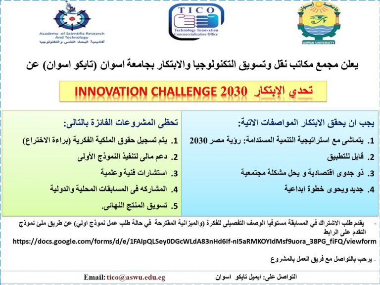 يعلن مجمع مكاتب نقل وتسويق التكنولوجيا والابتكار بجامعة اسوان عن تحدى الابتكار 2030 Innovation challenge يجب ان يحقق الابتكار...
