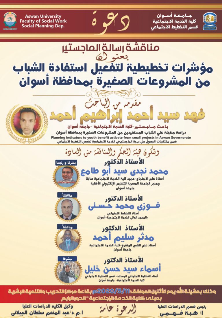 دعوة عامة لمناقشة رسالة الماجستير للباحث/ فهد سيد أحمد  – تحت عنوان ”مؤشرات تخطيطة لتفعيل استفادة الشباب من...