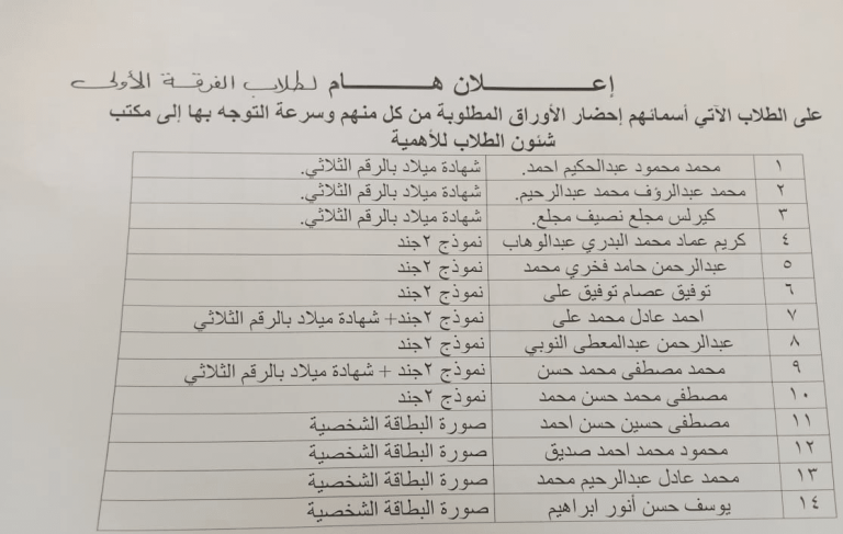 إعـــــــــــــــــــلان هام علي الطلاب الاْتي أسمائهم إحضار الاوراق المطلوبة من كل منهم وسرعة التوجة بها إلي مكتب شئون الطلاب للأهمية