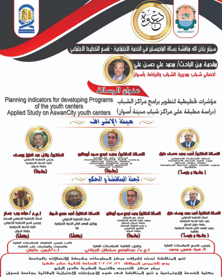 سوف يتم مناقشة رسالة الماجستير في الخدمة الاجتماعية قسم التخطيط الاجتماعي – مقدم من الباحث / محمد علي حسن علي...