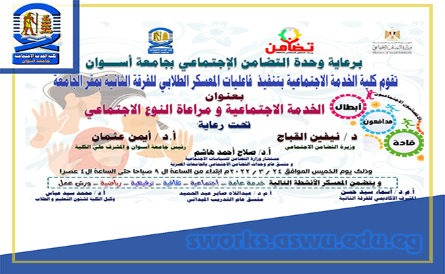 تحت رعاية “د/نيفين القباج – وزيرة التضامن الاجتماعي”، و” أ.د/ أيمن محمود عثمان -رئيس جامعة أسوان والمشرف على كلية الخدمة الإجتماعية”، و”أ.د/ صلاح أحمد هاشم – مستشار وزارة التضامن للسياسات الاجتماعية ومنسق عام وحدات التضامن الاجتماعي بالجامعات المصرية” قامت كلية الخدمة الاجتماعية يوم الخميس الموافق ٢٠٢٢/٣/٢٤م بتنفيذ فاعليات المعسكر الطلابي للفرقة الثانية بمقر الجامعة، تحت […]